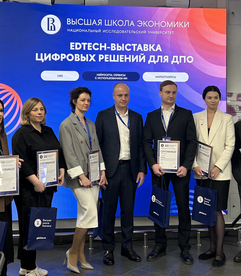 Старший директор НИУ ВШЭ Андрей Лавров (в центре) на открытии EdTech-выставки цифровых решения для ДПО с представителям компаний-партнеров.