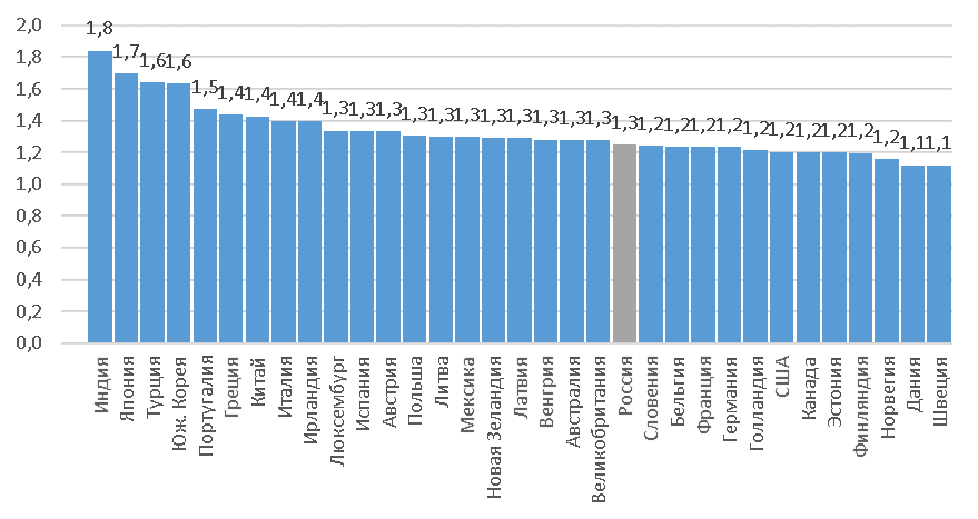 Рисунок 1. Отношение объема временных затрат в работе по дому у женщин по сравнению с мужчинами.