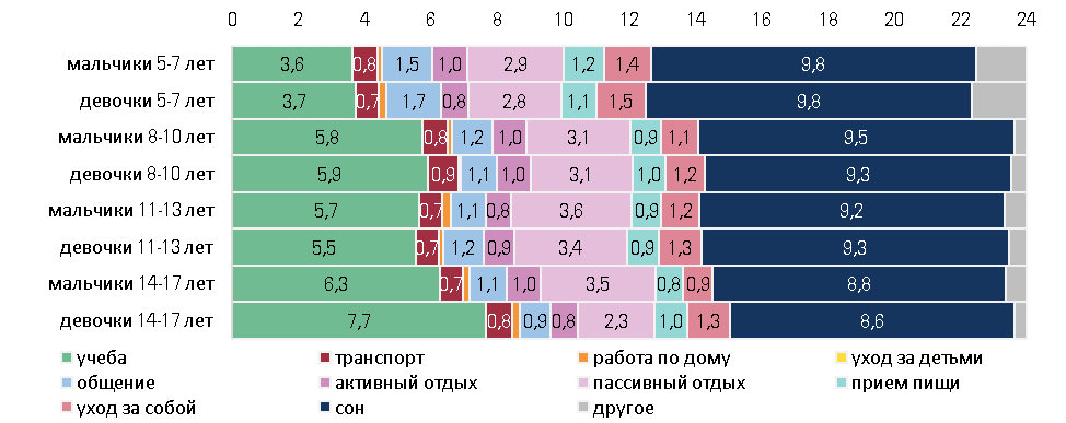 Рисунок 2. Структура бюджетов времени девочек и мальчиков 5-17 лет по возрастным группам.