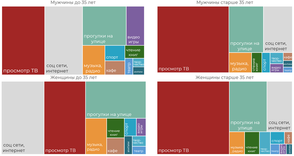 Рисунок 4. Структура досуга мужчин и женщин младше и старше 35 лет.